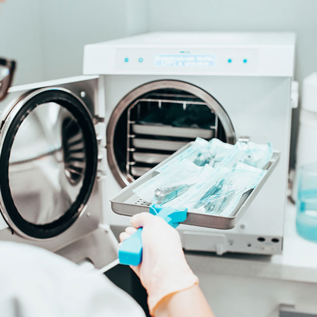 治療に使用した器具は、滅菌パックに入れて洗浄・滅菌を行うことを徹底しております。滅菌器は世界高基準であるクラスBのものを採用し、複雑な構造になっているハンドピース(タービン)は専用の滅菌器にて滅菌処理を行うなど、ハイレベルな衛生管理を徹底。「外来環(歯科外来診療環境体制)」という厚生労働省が定めた医療機関の設備基準もクリアしています。また、AEDなど緊急時の対応設備も完備し、すべての患者さまに安心して治療を受けていただける環境づくりを心がけております。
