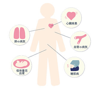 出血した歯ぐきから歯周病菌が入り込み、血流に乗って全身を巡ると、糖尿病、心疾患、脳血管疾患、動脈硬化、早産・低出生体重児リスクの増大など、さまざまな全身疾患を引き起こす原因となります。また歯周病菌が誤嚥によって肺に入ると誤嚥性肺炎を起こすことや、糖尿病によって歯周病が発症したり悪化することも報告されています。 身体全体の健康を守るためにも、歯周病の予防と早期発見・早期治療に取り組むことが大切です。